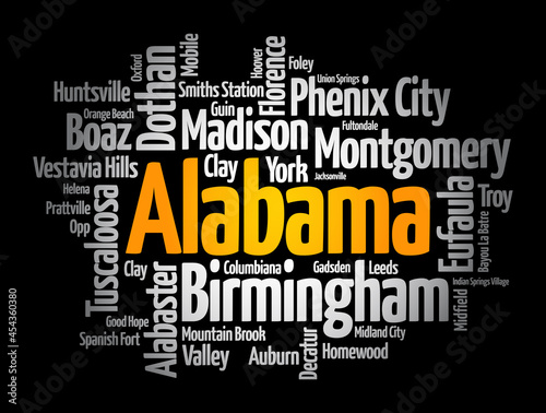 List of cities in Alabama USA state, word cloud concept background