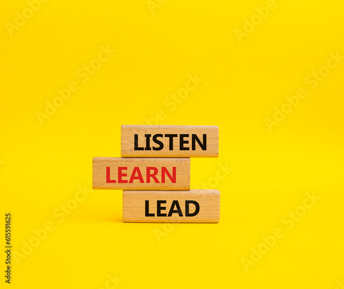 Listen Learn Lead symbol. Concept words Listen Learn Lead on wooden blocks. Beautiful yellow background. Business and Listen Learn Lead concept. Copy space.