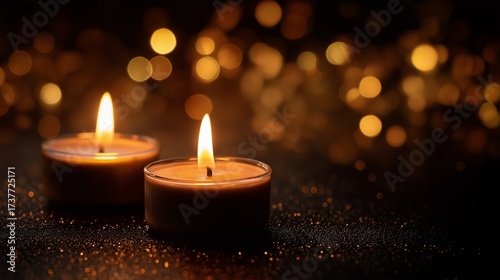 Lit candles on a dark background with golden light, space for text