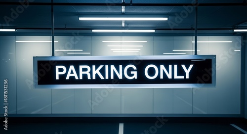 Lit Parking Sign Illuminates Restricted Area In Stark Architectural Parking Structure