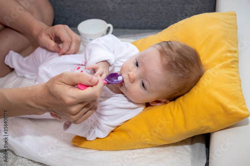 Little baby girl eating rice soup with spoon. Happy little cute daughter with blue eyes. The baby girl is four months old.