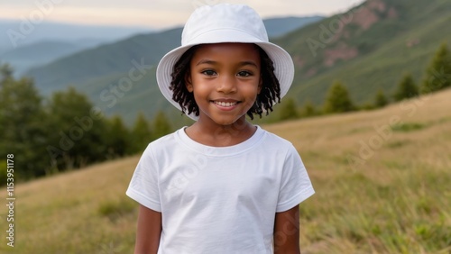 Little black girl with short hair wearing white t-shirt and white bucket hat standing on a mountain