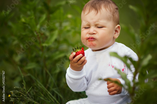 little funny boy sitting in grass with strawberry
