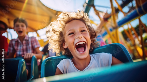 Little girl having exciting experience in the roller coaster at an amusement park.