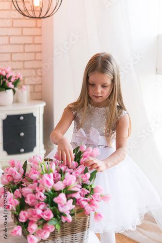 Little girl is standing in the bedroom. Large bouquet of tulip flowers. Princess in a white dress with a bouquet of pink flowers in the room.