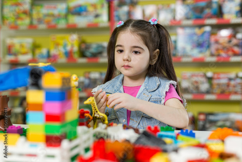 Little girl playing with construction blocks
