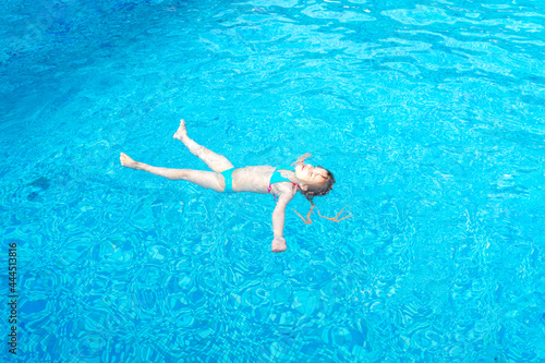 little girl swims in a swimming pool with blue water on a summer day