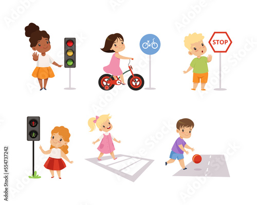 Little Kid Pedestrian Learning Road Sign and Traffic Rule Vector Set