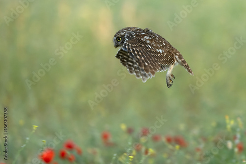 Little owl in its breeding territory in an olive grove within a Mediterranean forest with the first light of sunrise