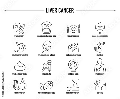 Liver Cancer symptoms, diagnostic and treatment vector icon set. Line editable medical icons.