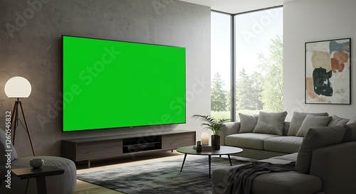 Living Room Interior with Large Green Screen Tv and Modern Decor