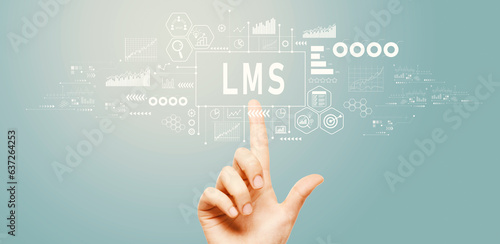 LMS - Learning Management System with hand pressing a button on a technology screen