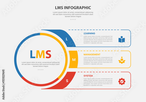 LMS learning management system infographic outline style with 3 point template with big circle and fluid rectangle box container for slide presentation