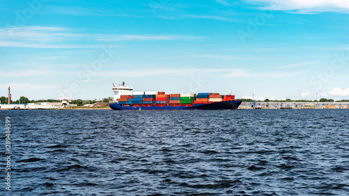 Loaded container cargo ship going through the port during sunny summer day.