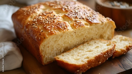 Loaf of crusty artisan bread, sliced on wooden board, sprinkled with sesame seeds.