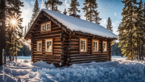 Log house in Siberia in winter, frost on the trees