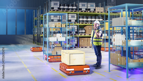 Logistics. Automation, Robotics, Warehouse. Worker in safety vest communicates by radio while autonomous robots transport goods and crates in smart industrial storage facility.