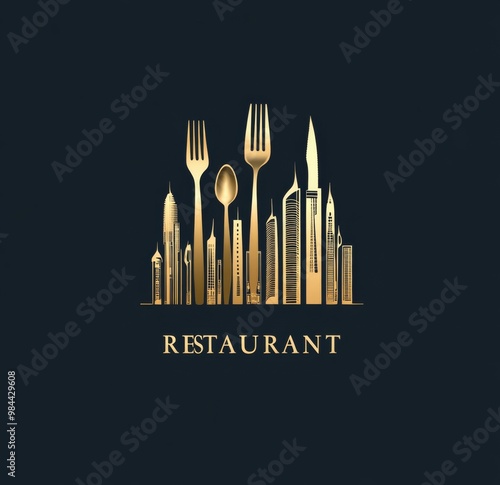 logo design for a restaurant featuring modern buildings and cutlery, with the text "RESTAURANT" in golden letters against a black background.