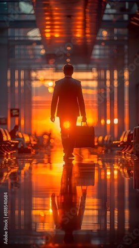 Lone Businessman Strolling Through Illuminated Airport Corridor at Dawn