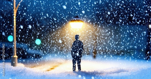 Lone figure stands beneath streetlight during heavy snowfall. Winter scene evokes solitude, quiet beauty. Cold atmosphere dominates composition.