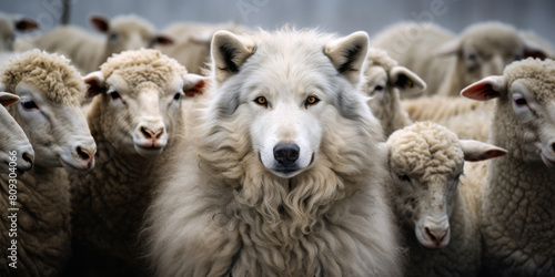 Lone Wolf Disguised Among Sheep, Staring At Camera. Wolf Hidden Within Flock Of Sheep. Generative AI