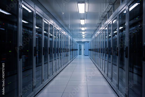 Long aisle of server racks in a brightly lit data center with reflective floor server room technology