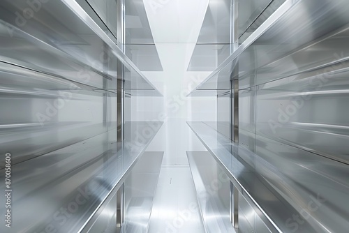 Long corridor with stainless steel shelves