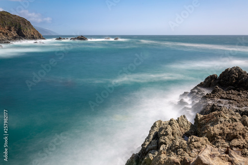 Long exposure of deep blue water, swirling surf, and rocky cliffs of central California