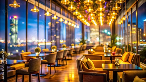 Long Exposure Restaurant Lounge Photography: Night City Lights, Bokeh, Interior Design, Ambient Lighting