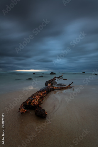 Long Exposure Stormy Baltic Sunset with a piece of driftwood on the beach at the Lithuanian Coast