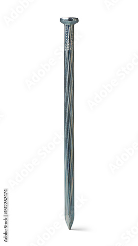 long metal concrete nail isolated white background, single fastener used in hard materials like concrete, brick or masonry with flat round head and long twisted shaft, side view with shadows