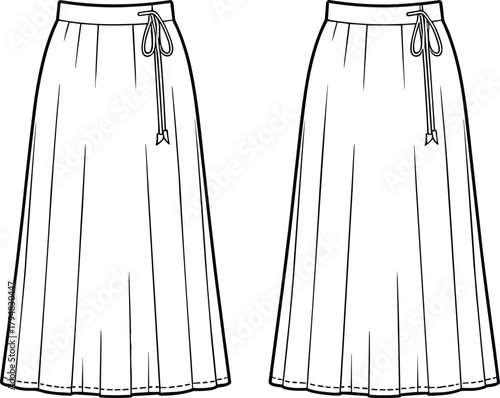 Long pleated skirt fashion sketch, drawstring waist apparel design, cad drawing flat vector illustration template
