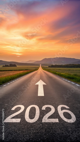 Long road stretches into horizon under vibrant sunset sky, with 2026 and arrow painted on asphalt, symbolizing future direction