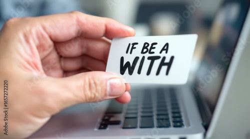 long term student goals concept. Holding a card with motivational words beside a laptop.