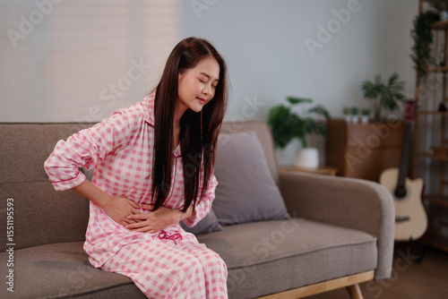Longevity Lifestyle Moment Asian Young Adult Woman Experiencing Abdominal Discomfort or Stomach Pain at Home on Couch Wellness Journey