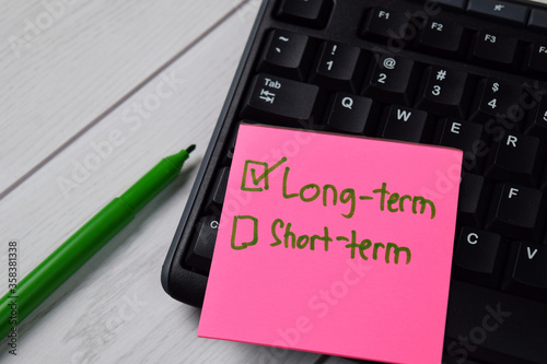 Long-term and Short-term write on a sticky note. Supported by an additional services isolated wooden table.