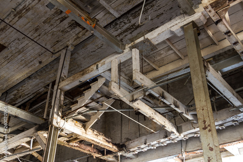 Looking up into the ceiling of an abandoned factory with wooden stairs