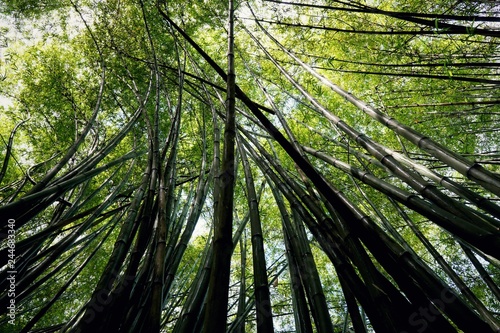Looking up of bamboo forest with sunlight as a background, Abstract leaves texture, Natural green wallpaper, Ecological Concept,
