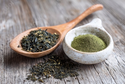 Loose leaf tea and powdered tea are on a weathered wooden surface with a wooden spoon and ceramic bowl