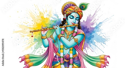 Lord krishna, the hindu deity, plays his flute amidst colorful watercolor splashes on a clean white background, radiating peace and divinity
