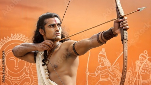 Lord Rama with bow arrow on orange background. Ram Navami celebration background for religious holiday