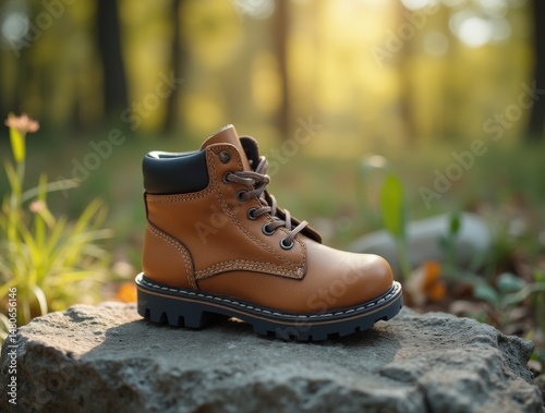 Lost child’s shoe placed on weathered stone, symbolizing absence and memory