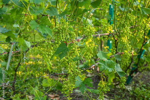 Lot of ripe green grapes. Harvest concept. Ingredients for production of wine. Home winemaking. Agribusiness. fresh fruits, Macro. Soft focus