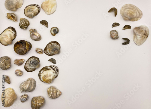 Lots of shells. Shells on a white background. Seashells background. Shells macro photo