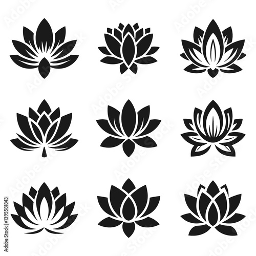 lotus flower silhouette logo set | minimal lotus flower logo set – black silhouette icons for meditation and wellness | minimalist vector icons for yoga and spa