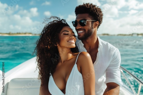 Love and Voyage: A couple enjoys the sun and the sea on the yacht, with the turquoise water creating a joyful atmosphere.