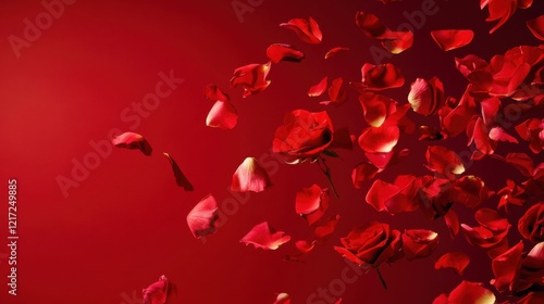 Love in Bloom: A Stunning Display of Passionate Red Roses and Delicate Petals, Adorning a Rich Crimson Canvas, Symbolizing the Beauty and Joy of Love.
