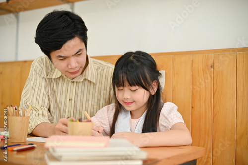 Lovely cute young Asian girl doing homework, having an art class with her private tutor.