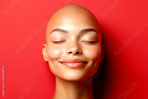 Lovely smiling mixed-race girl - for ads, flyer and internet use. Short coiffure - bald head - no hair. Commercial ad visual idea art. Short hair ad photo. Colored portrait look. Colored girl.