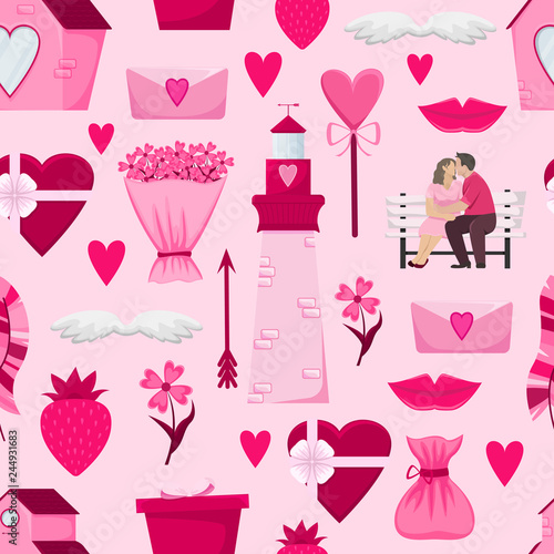 Lovely vector seamless pattern for Valentine's day. Flat cartoon illustrations.